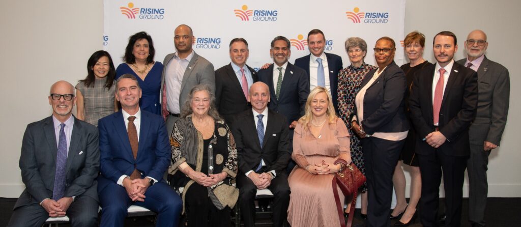 Front row, l-r: Allen Waxman, Jason Kyrwood, Margery E. Ames, Esq., Rising Ground CEO Alan Mucatel, and Dorothy Mehta.